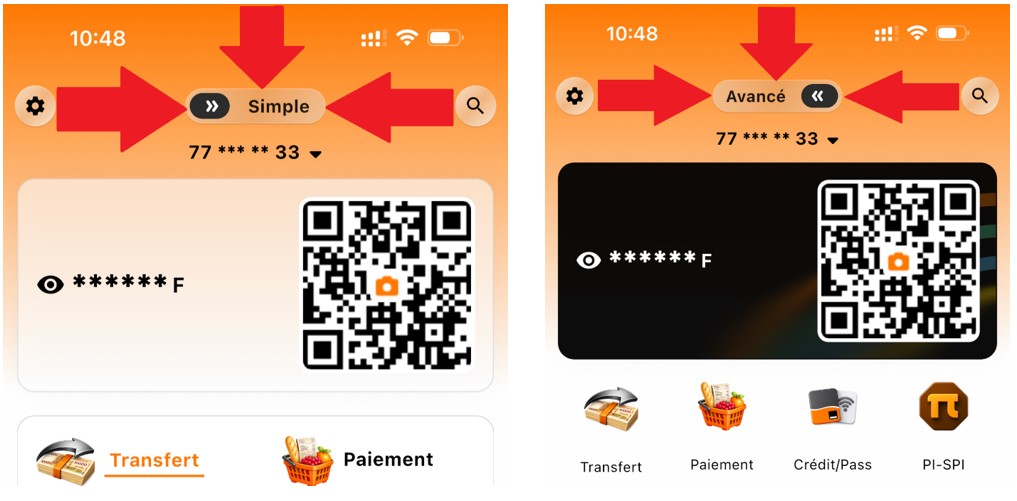 Le Mode Simple affiche uniquement les fonctionnalités essentielles du quotidien. L'écran d'accueil présente deux pages accessibles par glissement : Orange Money à gauche, les services Telco à droite. Idéal pour aller droit au but.