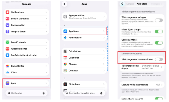 - Dans la section « Données cellulaires », désactivez les « téléchargements automatiques »